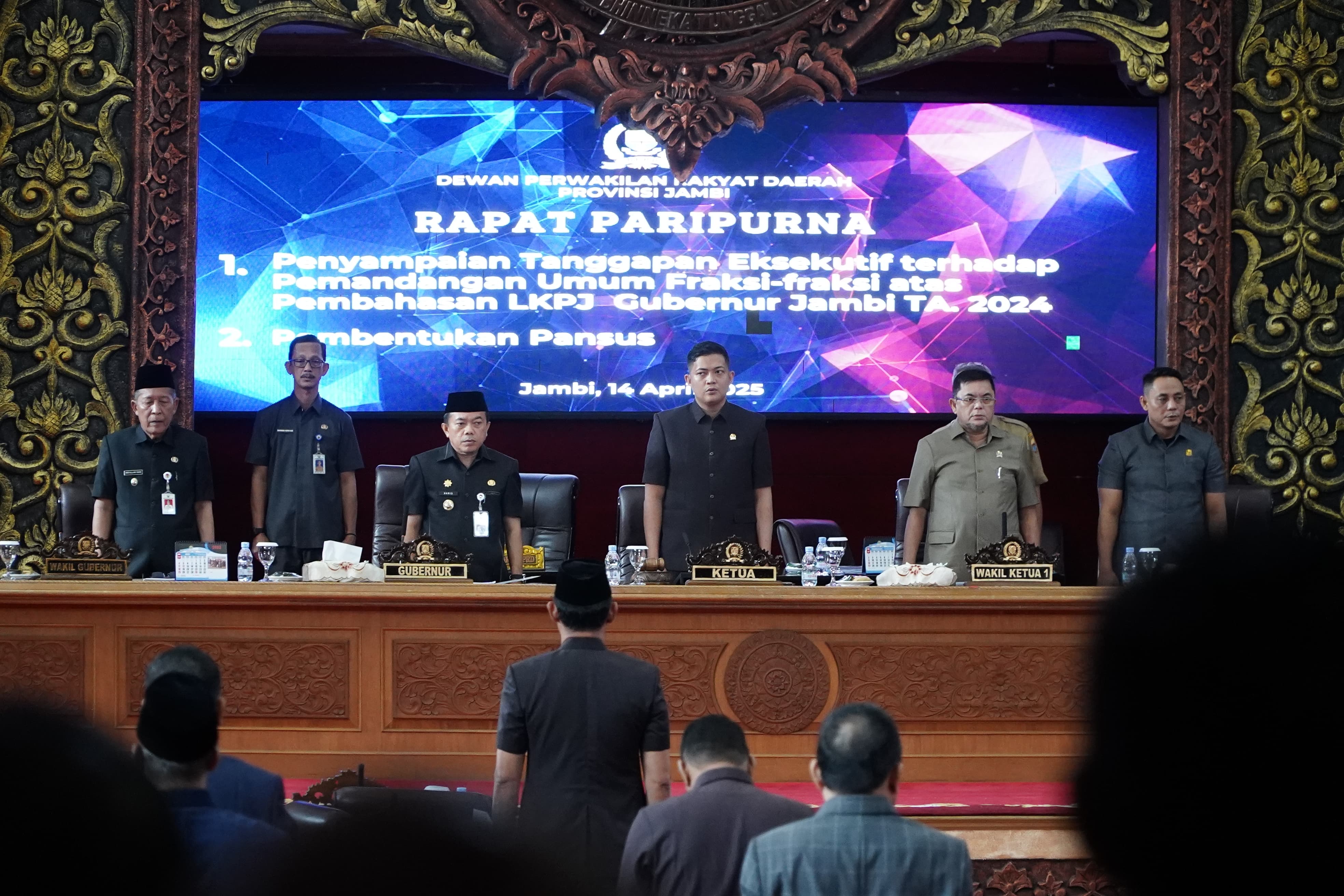 Jambi,Rakjat.com- Gubernur Jambi Dr. H. Al Haris, S.Sos. MH menyampaikan, sebagaimana diketahui bahwa pada Rapat Paripurna DPRD pada tanggal 9 April 2025, Fraksi-fraksi Dewan telah menyampaikan Pandangan Umum terhadap Laporan Keterangan Pertanggungjawaban (LKPJ) Gubernur Jambi Tahun 2024. Hal tersebut disampaikan Gubernur saat memberikan Jawaban Pemerintah Atas Pandangan Umum Fraksi-fraksi DPRD Provinsi Jambi pada, terhadap Laporan Keterangan Pertanggungjawaban (LKPJ) Gubernur Jambi Tahun 2024, bertempat di Ruang Sidang Utama Gedung Dewan Perwakilan Rakyat (DPRD) Provinsi Jambi, Senin (14/04/2025) pagi.