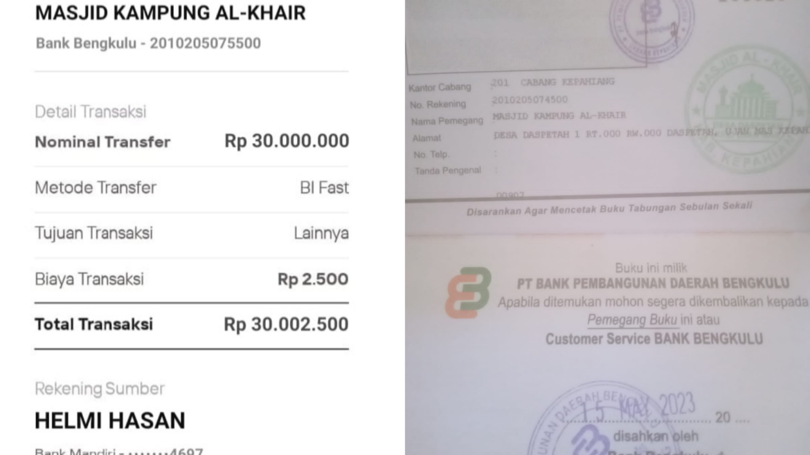 Seperti diikatakan pengurus masjid Kampung Al Khair, Desa Daspetah, Kabupaten Kepahiang Dasril, Jumat (19/5). Oknum tersebut mengaku telah mentransfer sejumlah uang untuk masjid tersebut atas nama Walikota Bengkulu, tetapi setelah di cek tak ada dana yang masuk ke rekening masjid.