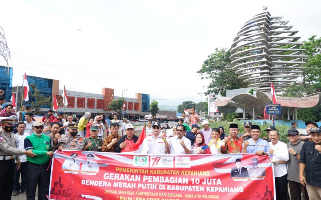 Kepahiang, Rakjat.com - Dalam rangka memeriahkan HUT Ke-77 Proklamasi Kemerdekaan Republik Indonesia di Kabupaten Kepahiang. Bertempat di Lapangan Tugu Kopi Kepahiang Wakil Bupati H. Zurdi Nata bersama Forkopimda Kepahiang, Kepala Dinas /Instansi serta organisasi kepemudaan di Kabupaten Kepahiang membagikan 5000 lembar bendera merah putih yang akan disebar keseluruh kecamatan, Jumat (12/12/2022) Pukul 14.00 Wib.