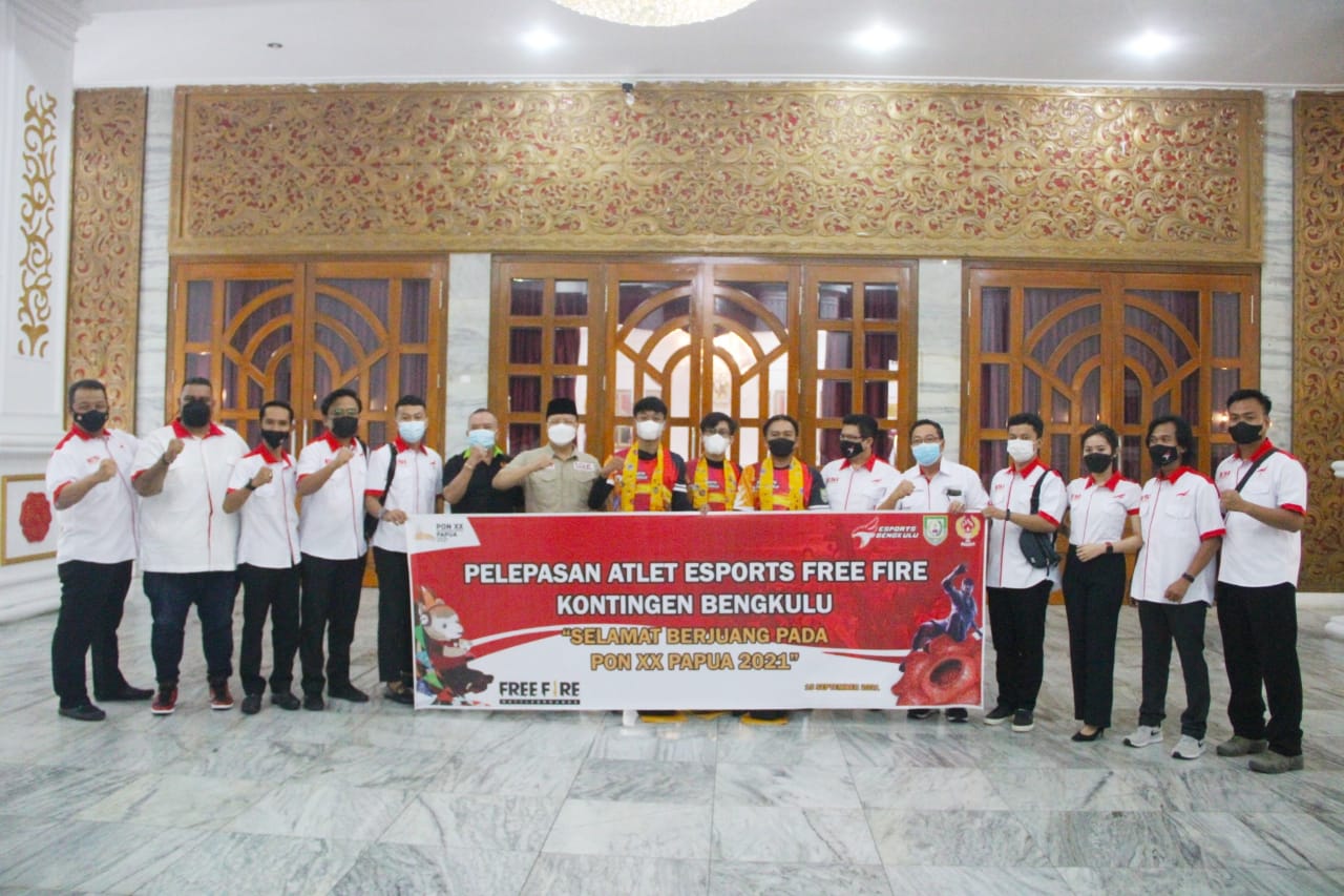 Bengkulu, Rakjat.com - Gubernur Bengkulu Rohidin Mersyah pimpinan Pelepasan Atlet E-Sports Free Fire (FF) Kontingen Bengkulu yang akan berlaga pada Pekan Olahraga Nasional (PON) XX Papua 2021 di Gedung Daerah Balai Raya Semarak Bengkulu, Rabu (15/09) malam.