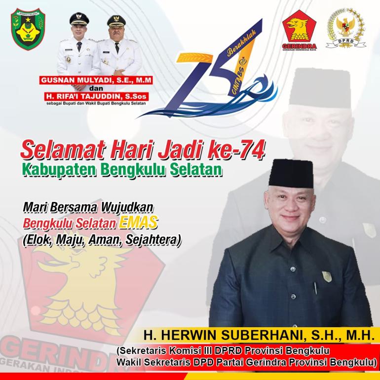 Bengkulu - Sekretaris Komisi III DPRD Provinsi Bengkulu H Herwin Suberhani SH MH mengucapkan Selamat Hari Ulang Tahun (HUT) ke-74 Kabupaten Bengkulu Selatan.