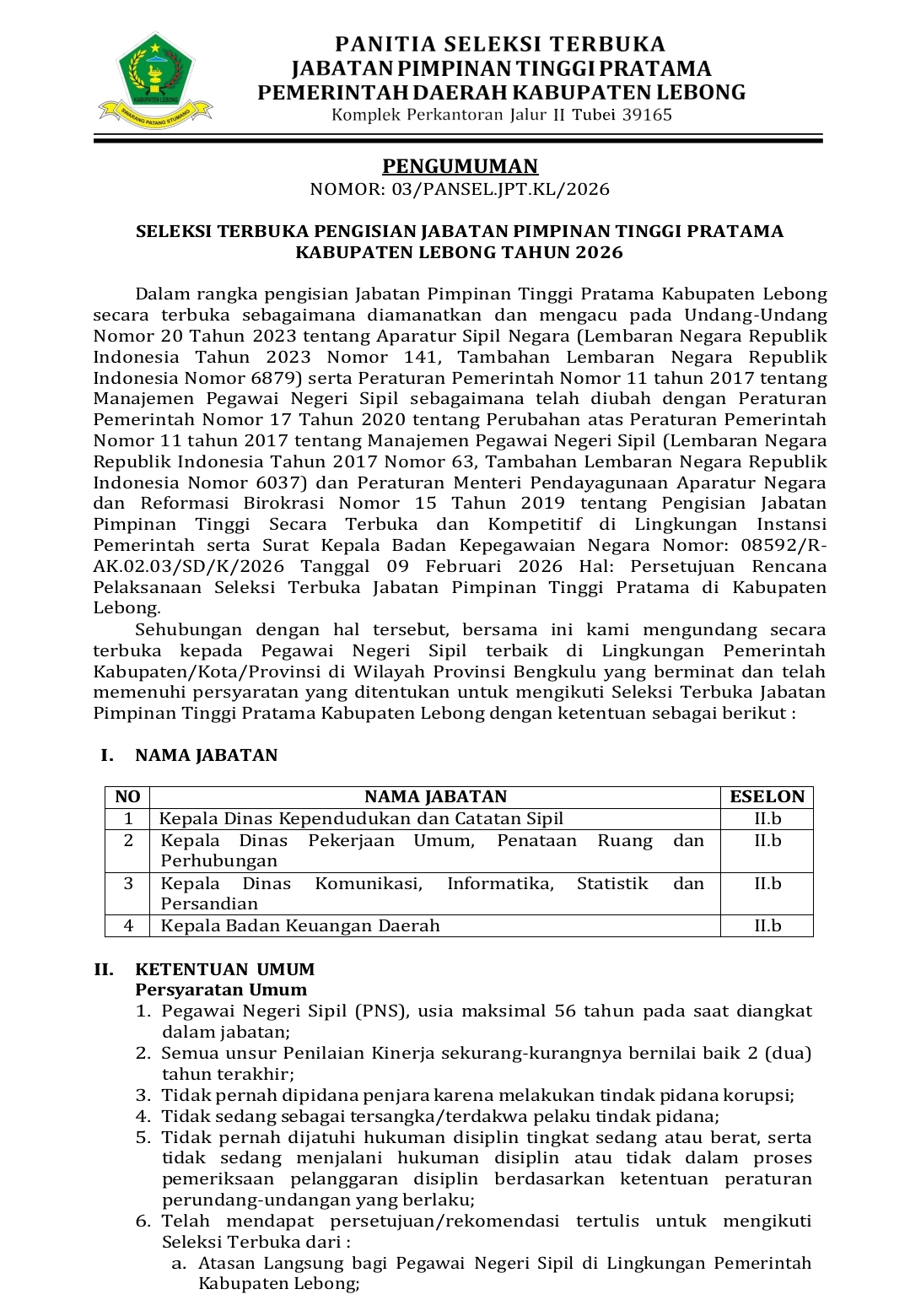 Lebong, rakjat.com – Pemerintah Kabupaten (Pemkab) Lebong resmi membuka seleksi terbuka pengisian Jabatan Pimpinan Tinggi (JPT) Pratama tahun 2026. Seleksi ini dilakukan untuk mengisi sejumlah jabatan strategis yang saat ini masih kosong dan sementara dijabat oleh pelaksana tugas (Plt).