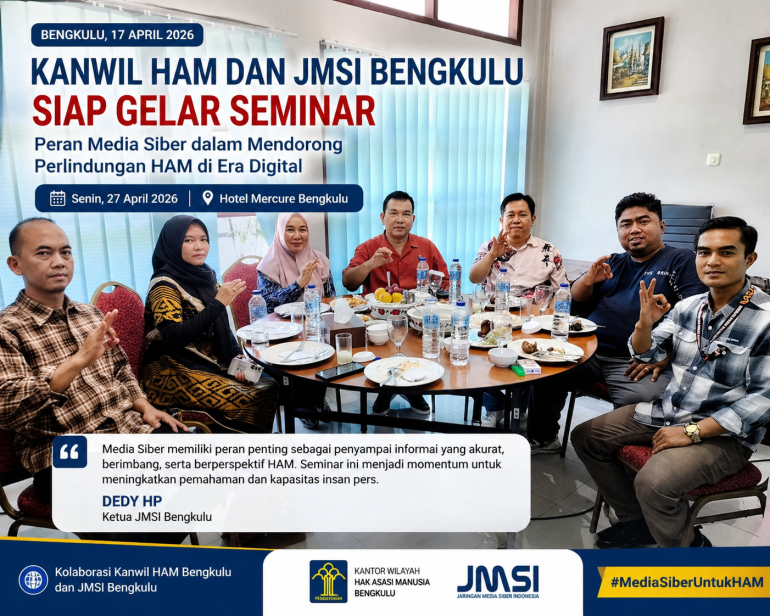 Bengkulu,Rakjat.com – Kantor Wilayah (Kanwil) Hak Asasi Manusia (HAM) berkolaborasi dengan Jaringan Media Siber Indonesia (JMSI) Bengkulu akan menggelar seminar bertema “Peran Media Siber dalam Mendorong Perlindungan HAM di Era Digital”.