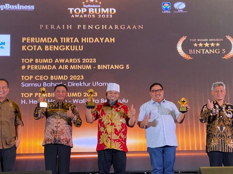 Dibulan penuh berkah ini, Kota Bengkulu mendapatkan 3 penghargaan diantaranya TOP BUMD Awards 2023 untuk kategori Perumda Air Minum dengan label “Bintang 5, dua penghargaan lain yang direngkuh ialah kategori Top CEO BUMD untuk Direktur Utama Perumda Tirta Hidayah Samsu Bahari serta Top Pembina BUMD 2022 untuk Walikota Bengkulu Helmi Hasan, dan ini untuk ke lima kali secara berturut.
