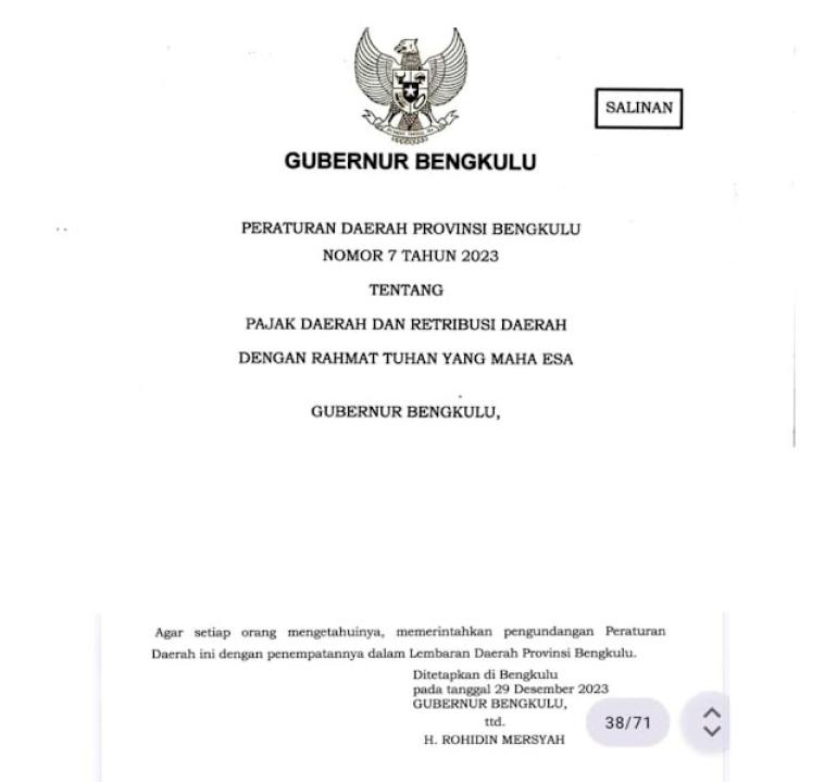 Padahal, berdasarkan Undang-undang dan diperkuat dengan Peraturan Daerah (Perda) zaman Gubernur Rohidin Mersyah dan Ketua DPRD Ihsan Fajri lah yang menyebabkan kenaikan pajak di Bengkulu tertinggi se Indonesia. Yakni tertuang dalam Perda nomor 7 tahun 2023 tentang Pajak Daerah dan Retribusi Daerah.