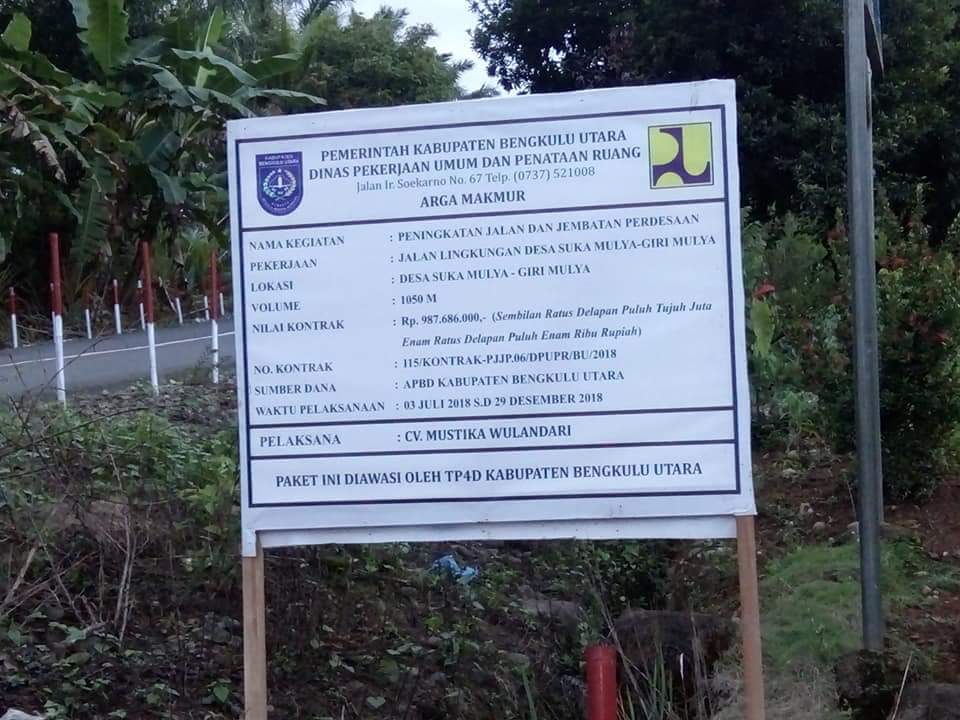 Bengkulu Utara, Rakjat.com - Lembaga Swadaya Masyarakat (LSM) Kibar Menyayangkan dengan berhentinya pekerjaan Jalan Lingkungan Desa Suka Mulya-Desa Giri Mulya yang dikerjakan oleh CV. Mustika Wukandari dengan Pagu 987.686.000 dengan waktu pelaksanaan tertanggal 03 Juli hingga 29 Desember 2018.