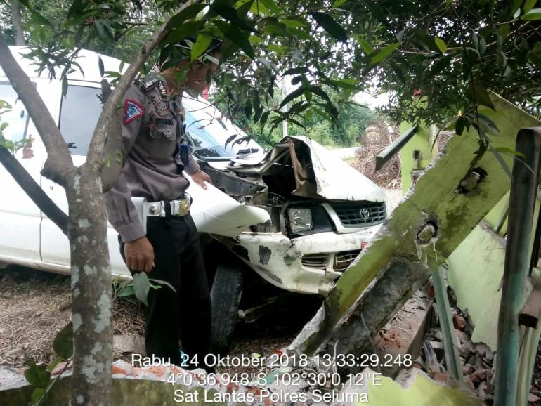 Seluma, rakjat.com - Akibat rem blong, Mobil jenazah tabrak pagar rumah warga di Jalan Raya Desa Tumbukan Kecamatan Lubuk Sandi Kabupaten Seluma, Rabu(24/10).