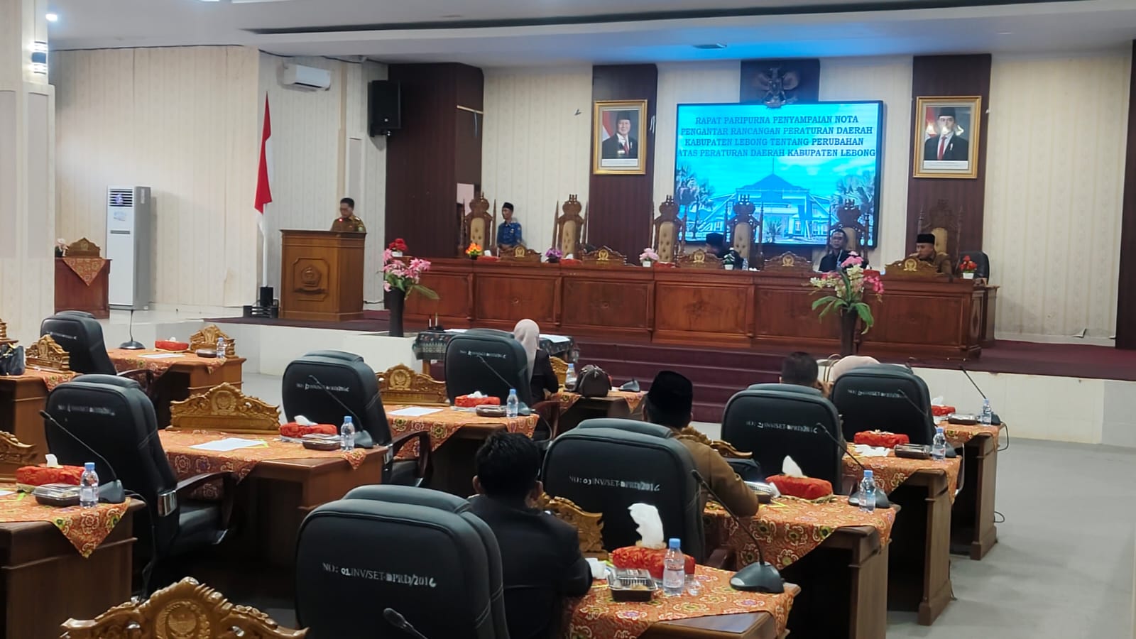 Nota pengantar tersebut disampaikan langsung oleh Bupati Lebong, Azhari. Dalam penyampaiannya, Bupati menyebutkan bahwa Pemerintah Kabupaten Lebong telah menyelesaikan enam Raperda dari total 17 Raperda dalam Program Pembentukan Peraturan Daerah (Propemperda).