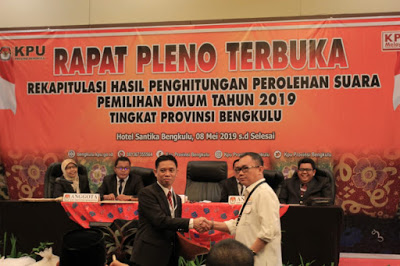 Bengkulu,Rakjat.com - Komisi Pemilihan Umum (KPU) Provinsi Bengkulu menggelar Rapat Pleno Terbuka Rekapitulasi Hasil Penghitungan Perolehan Suara, Pemilihan Umum Tahun 2019 Tingkat Provinsi Bengkulu dan berlangsung dengan aman, lancar, serta kondusif.