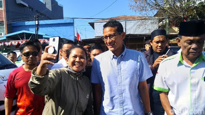 Makassar - Cawapres Sandiaga Uno mengunjungi Pasar Terong, Makassar, Sulawesi Selatan. Di pasar ini, pipi Sandiaga menjadi sasaran cubit emak-emak yang gemas terhadap pipinya.
