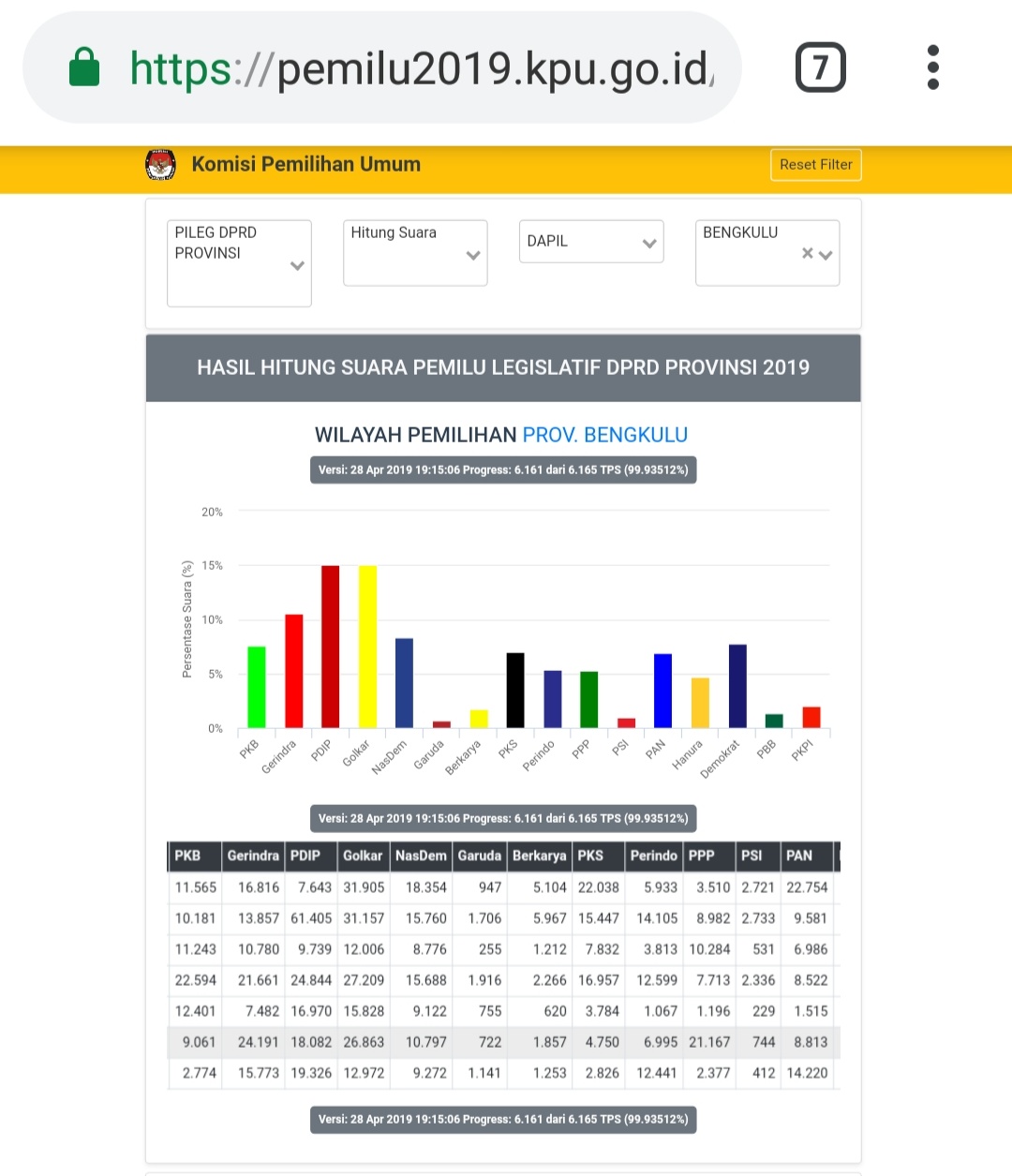 Bengkulu,Rakjat.com - Hasil Real Count Website Resmi Pemilu2019.KPU.go.Id, Partai PDIP Dapil 2 Kabupaten Bengkulu Utara-Bengkulu Tengah diprediksi Memborong tiga Kursi dengan perolehan Suara 61.405, Hasil Pantauan pukul 19.36 WIB.