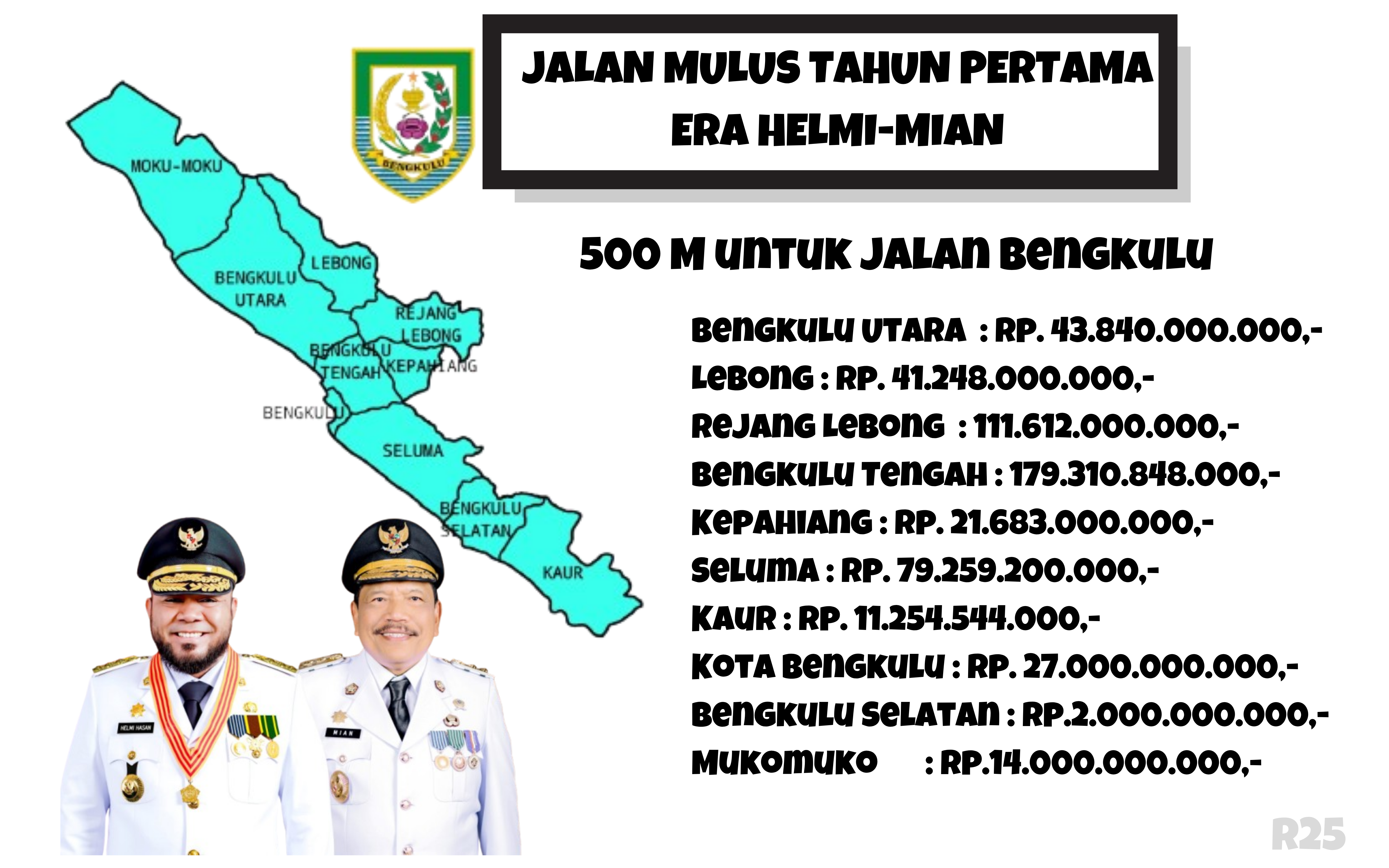 Tak tanggung-tanggung Rp. 541.207.592.000,- digelontorkan untuk rekontruksi, Rehabilitasi serta pembangunan jalan yang tersebar di 10 Kabupaten-Kota se-Provinsi Bengkulu.