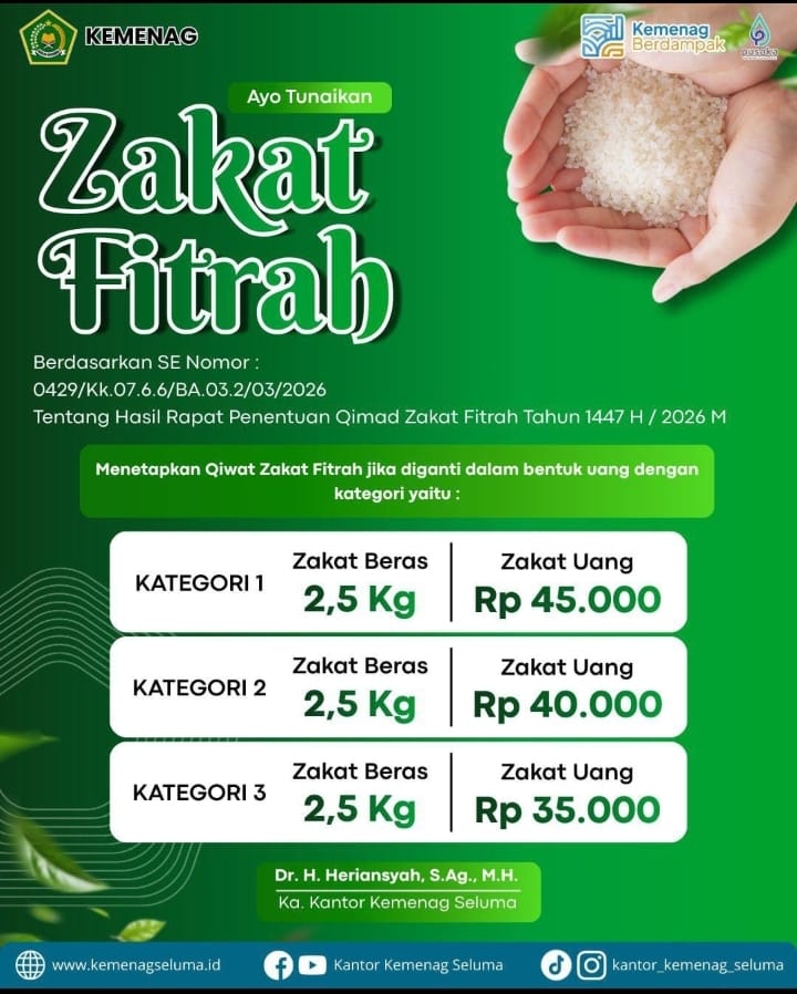 Kepala Kantor Kemenag Seluma, Dr. H. Heriansyah, S.Ag., MH, menjelaskan bahwa keputusan tersebut diambil melalui kesepakatan bersama agar menjadi pedoman yang jelas bagi umat Islam di Kabupaten Seluma dalam menunaikan kewajiban zakat fitrah.