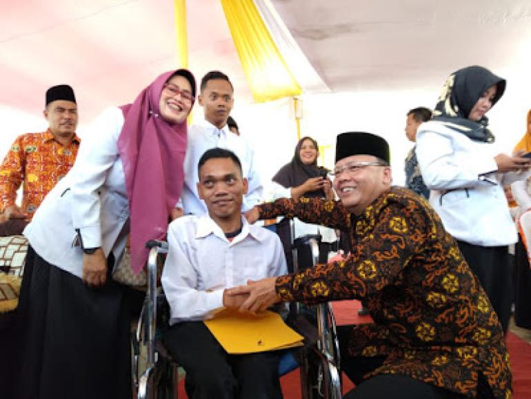 Seluma,Rakjat.com - Dalam kunjungan kerja ke Kabupaten Seluma, Gubernur Bengkulu Dr H Rohidin Mersyah menyerahkan secara Simbolis 281 SK GTT/PTT dan 95 SPK Tenaga Pendamping Profesional Desa Kabupaten Seluma, dalam acara ini ada menyita perhatian yakni Bangkit Dwi Apriyadi salah satu GTT SLB Seluma yang sangat gembira menerima SK dari Gubernur.
