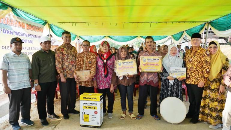 Bengkulu, Rakjat.com - Gubernur Rohidin Mersyah menyerahkan bantuan alat mesin pertanian berupa handsprayer dan cultivator kepada 17 kelompok tani di kabupaten Bengkulu Tengah bertempat di Desa Nakau.