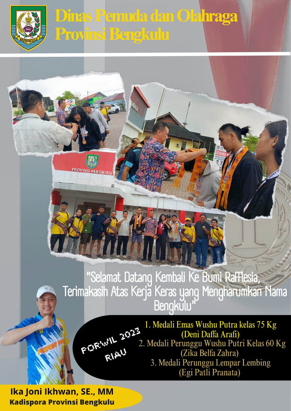Apresiasi dan Pujian disampaikan oleh Kepala Dinas Pemuda dan Olahraga Provinsi Bengkulu Ika Joni. "Terima kasih atas kerja keras yang mengharumkan nama Bengkulu," kata Ika Joni.