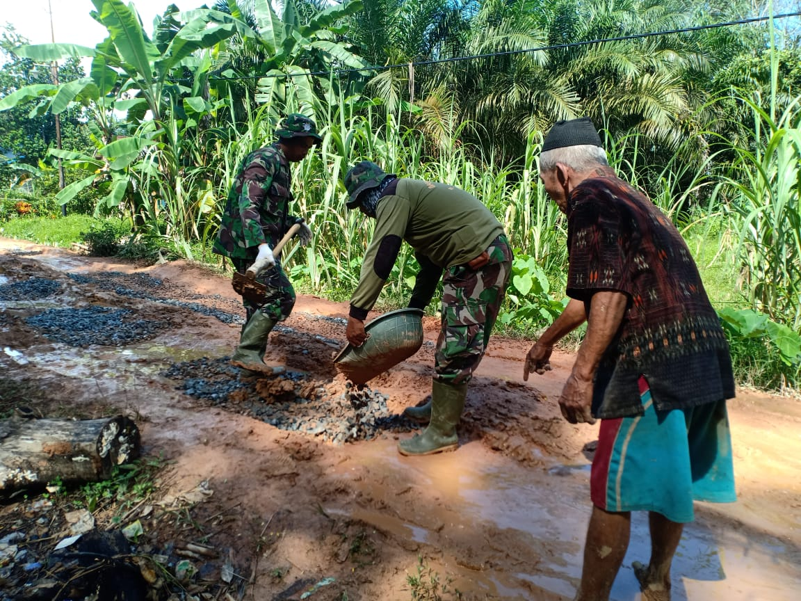 Satgas TMMD Bersama Warga Timbun Jalan Yang Berlubang