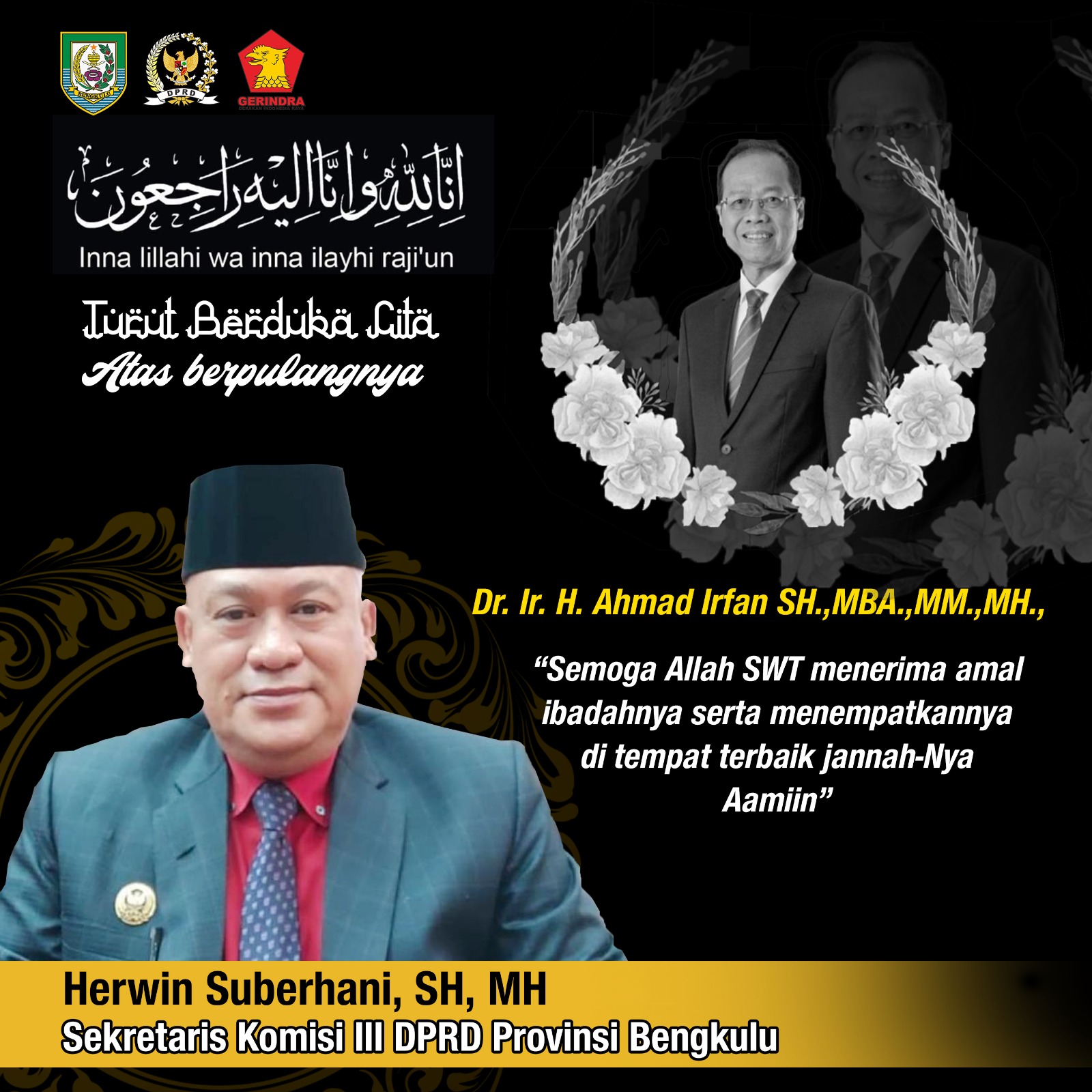 Bengkulu, Rakjat.com - Sekretaris Komisi III DPRD Provinsi Bengkulu H Herwin Suberhani SH MH turut berbelasungkawa atas wafatnya Direktur Utama Bank Bengkulu Dr Ir H Ahmad Irfan SH MBA MM MH CWM CPD.