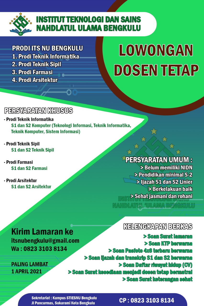 Bengkulu,Rakjat.com - Institut Teknologi dan Sains Nahdlatul Ulama (ITS NU) Bengkulu membuka lowongan dosen tetap. Lowongan dosen tetap itu untuk mengajar 4 program studi, yakni Prodi Teknik Informatika, prodik Teknik Sipil, Prodi Farmasi dan prodi Arsitektur.